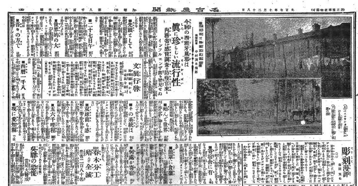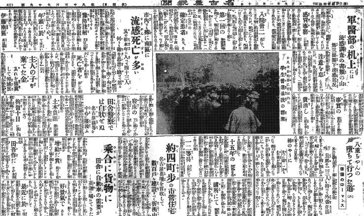 日本では、米騒動が起こり、社会問題が表面化し、普選運動が活発となって社会も政治も騒然とした中でした。当時の名古屋は、大名古屋の建設に向けての始動の時期でもありました。当時の名古屋新聞(中日新聞の前身)の記事から、「スペイン風邪」(記事では「流行性感冒」)について記事をひろってみました。