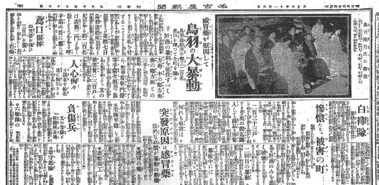 ・感冒が原因して鳥羽の大暴動。鳥羽造船所の職工200名、鳶口をふるって全町を襲う、奸商の暴利を征伐すべく。